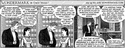 As Bosman describes, “Children ages 9 to 11 are more likely to be frequent readers if their parents provide interesting books to read at home and set limits on time spent using technology like video games.” Indeed. And with that I give you the following, brilliant David Malki Wondermark comic strip: